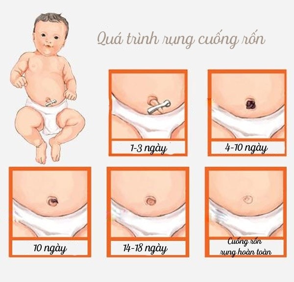 Thông thường, cuống rốn sẽ rụng trong khoảng 10-14 ngày tuổi, nhưng trong một số trường hợp hiếm hoi, quá trình này có thể kéo dài hơn 3 tuần. Cần giữ cho rốn khô ráo và kiểm tra vùng da xung quanh hàng ngày. Vệ sinh nhẹ nhàng các chất tiết bám trên rốn và lau khô. Lưu ý không sử dụng cồn hoặc các chất sát khuẩn khác để bôi lên rốn. Khi thay tã, tránh để tã đè lên cuống rốn. Nếu sau 3 tuần mà rốn vẫn chưa rụng, mẹ nên đưa trẻ đến bác sĩ để được kiểm tra.