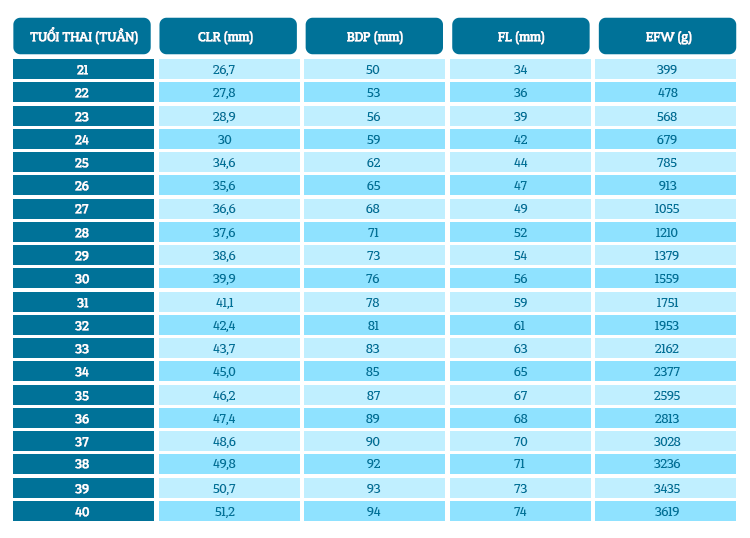 Bảng theo dõi chỉ sổ BPD thai nhi theo tuần