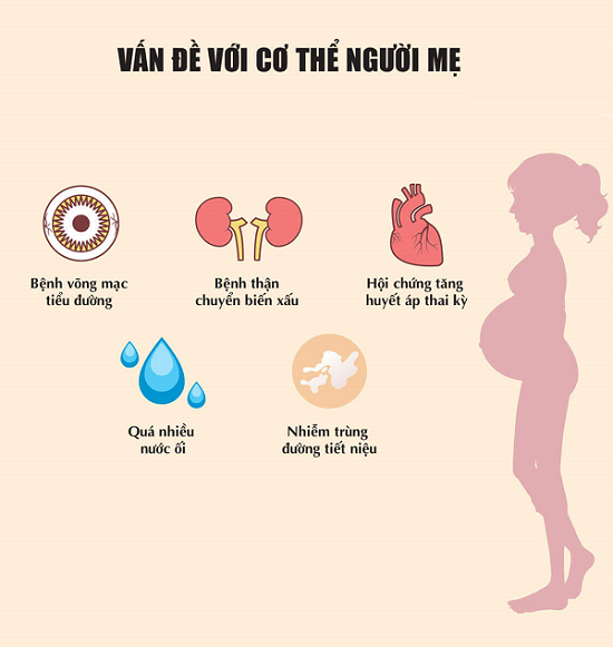 Sinh non: Lượng đường trong máu cao làm tăng nguy cơ chuyển dạ sớm và sinh con trước ngày dự sinh của thai phụ. Hoặc thai phụ được khuyến nghị sinh sớm vì em bé đã quá lớn.