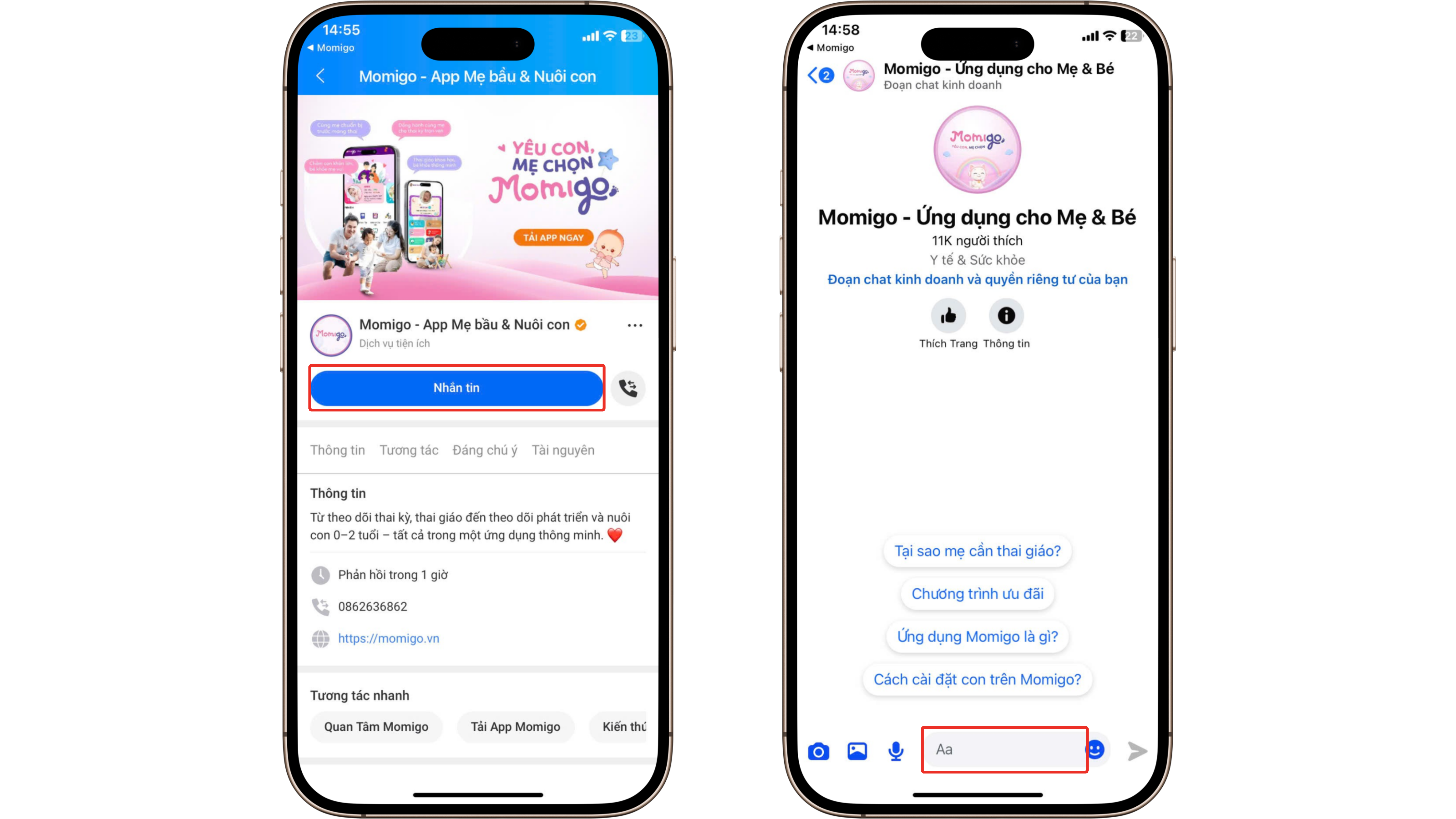 - Messenger (Fanpage): Momigo - Ứng dụng Mẹ & Bé