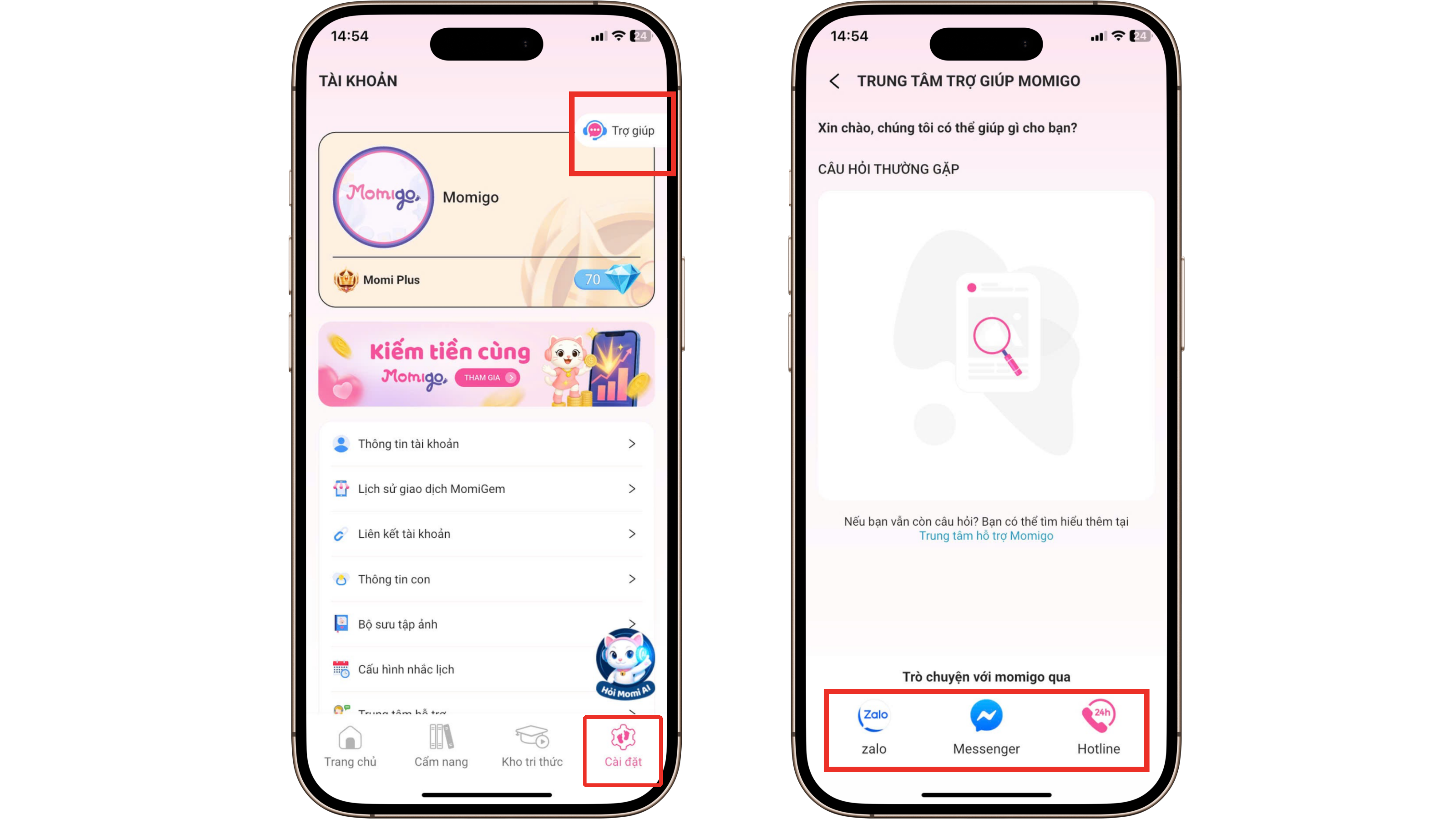 Ba mẹ có thể liên hệ với Momigo trực tiếp trong ứng dụng hoặc qua các kênh hỗ trợ chính thức theo hướng dẫn dưới đây:
